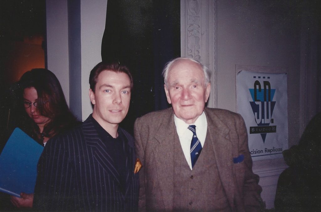 Why, because it was the text written on the Bond family coat of arms mentioned in the OHMSS book. In 1994 I added a phrase about Goldeneye which was being filmed at the time so technically this song mentions TWO Bond films. During Christmas 1995 while in New York to set up a toy business, I found out about a Bond event happening on the day after the NY premiere of Goldeneye at the Zeigfeld Theatre. I went there armed with a CD of the song and even managed to get a snap with Desmond Llewelyn (pictured below and sadly now my chin looks like Desmond’s). I bumped into Michael G Wilson there, showed him the CD and he told me to send it to Marcia Gleeman, the head of A&R at MGM but nothing happened of course. He would have seen the title of the CD and so would Marcia Gleeman so I have always wondered if the song may have inspired the naming of The World Is Not Enough that came out in 1997.